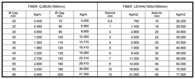 FİBER MAMÜLLERi ( Özgül Ağırlığı: 1,4 )