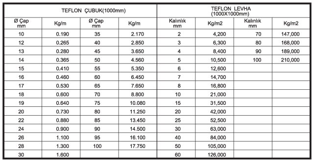 TEFLON ÇEŞİTLERİ ( Özgül Ağırlığı: 2,1 ))